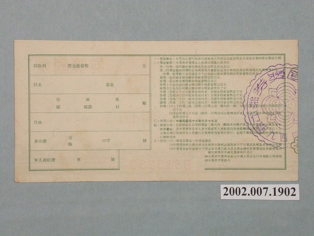 基本發行張數為六十萬張,橫式設計,由右至左,上列「愛國獎券」,「中華民國五十六年六月十五日開獎」,「乙聯」圓框,底飾古錢幣紋,「第449期」,「新臺幣伍圓」,下列中心編號「B533332」,底飾愛國獎券浮水印,花紋圓框內飾「龍舟競渡」紋樣,「臺灣省政府委託臺灣銀行發行」。