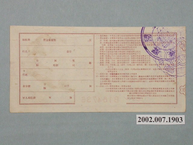 基本發行張數為六十萬張,橫式設計,由右至左,上列「愛國獎券」,花框內「中華民國五十六年六月廿五日開獎」,「乙聯」圓框是卷葉紋,底飾古錢幣紋,「第450期」,「新臺幣伍圓」,「臺灣省政府委託臺灣銀行發行」,下列中心編號「B184736」,底飾愛國致富浮水印,「宋瓷 三犧尊」紋樣。
