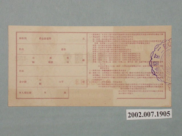 基本發行張數為六十萬張,橫式設計,由右至左,「第452期」,花葉紋,上列「中華民國伍拾陸年柒月拾伍日開獎」,「愛國獎券」,編號「B533333」,底飾愛國致富浮水印,「臺灣省政府委託臺灣銀行發行」,「新臺幣伍圓」,「乙聯」圓框飾花紋,底飾古錢幣紋。