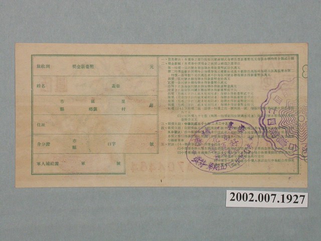 基本發行張數為六十萬張,橫式設計,由右至左,「松竹梅圖」及水仙花圖,右上列「新臺幣伍圓」,左上列「大地回春」四字方印,「中華民國伍拾柒年貳月貳拾伍日開獎」,「第474期」,「愛國獎券」底飾心行勾紋,下列編號「A704484」「臺灣省政府委託臺灣銀行發行」,「甲聯」圓框。