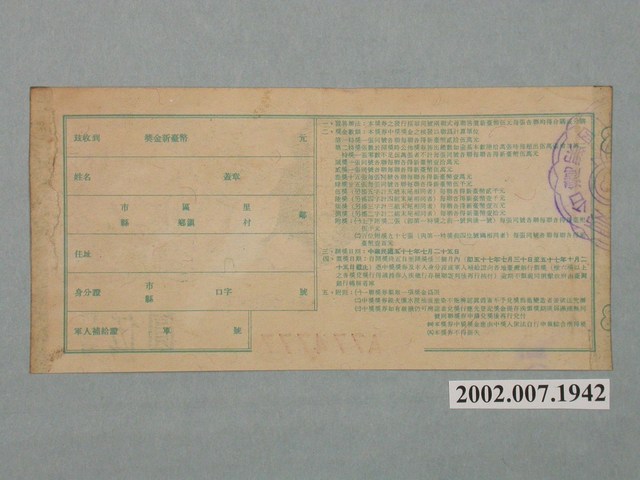 基本發行張數為六十萬張,橫式設計,由右至左,葡萄藤蔓圖,中心「愛國獎券」,下列「新臺幣伍圓」,「中華民國伍拾柒年柒月貳拾伍日開獎」,編號「A774777」,「甲聯」圓框,「第489期」,「臺灣省政府委託臺灣銀行發行」。