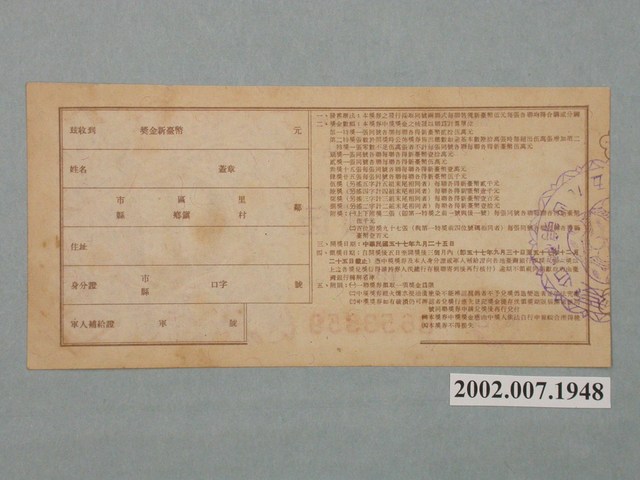 基本發行張數為六十萬張,橫式設計,由右至左,方形花草框中心圓圈內「愛國獎券」,「中華民國伍拾柒年玖月貳拾伍日開獎」,「臺灣省政府委託臺灣銀行發行」,「新臺幣伍圓」,「第495期」,下列中心編號「B653359」,「乙聯」圓框。