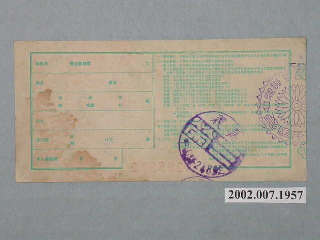 基本發行張數為六十萬張,橫式設計,「中華民國五十七年十二月廿五日開獎」,「第504期」,「彌勒佛」圖,「臺灣手工藝」,「臺灣省政府委託臺灣銀行發行」,下列編號「A295372」,方形花圈「愛國獎券」,「甲聯」圓框,「新臺幣伍圓」。
