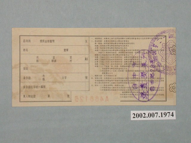 基本發行張數為六十萬張,橫式設計,「愛國獎券」,右下角「甲聯」圓框,「第521期」,國民生活規範(行之一):「乘坐公車,不得爭先恐後,應對老弱、婦孺、傷殘、疾病者讓座,並照顧其上下。」下列編號「A488125」,上列「臺灣省政府委託臺灣銀行發行」,「中華民國五十八年六月十五日開獎」,左上「新臺幣伍圓」。
