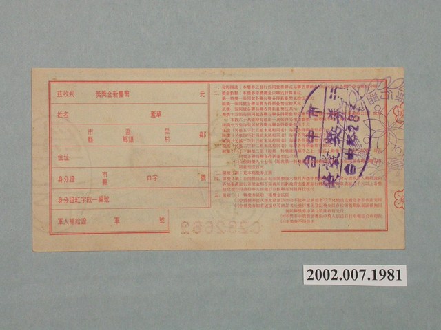 基本發行張數為六十萬張,橫式設計,國民生活規範(育的方面):「應教以合群與互助,榮譽與服務。」「愛國獎券」,「臺灣省政府委託臺灣銀行發行」,下列「丙聯」圓框,「新臺幣伍圓」,「第528期」,下列「中華民國五十八年八月廿五日開獎」,編號「C232662」。