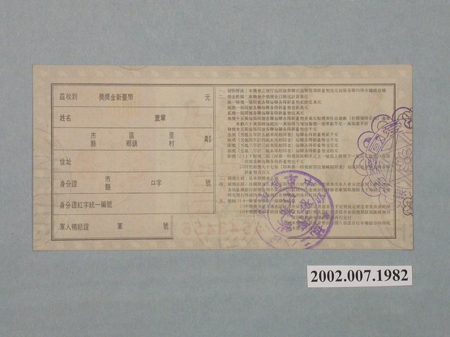 基本發行張數為六十萬張,橫式設計,「愛國獎券」,下列「甲聯」圓框,「新臺幣伍圓」,下列「臺灣省政府委託臺灣銀行發行」,國民生活規範(樂的方面):「應教以禮節樂和,合敬同愛。」左下角「第529期」,下列編號「A543456」,「中華民國五十八年九月五日開獎」。