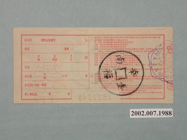 基本發行張數為六十萬張,橫式設計,「愛國獎券」,「中華民國五十八年十一月五日開獎」,「臺灣省政府委託臺灣銀行發行」,「第535期」,「新臺幣伍圓」,中心獻桃圖,下列編號「A522545」,「恭祝 總統華誕」,「萬壽無疆」,左下角「甲聯」圓框。