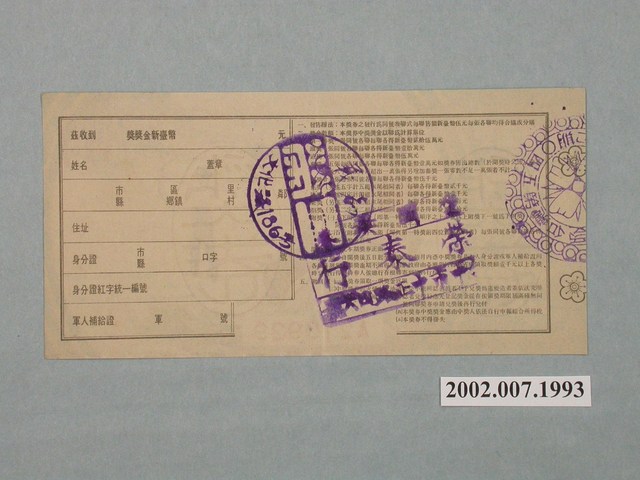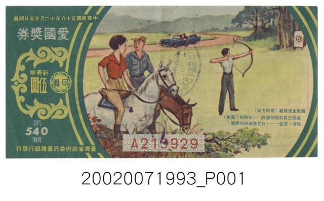 基本發行張數為六十萬張,橫式設計,國民生活規範(樂的方面):「提倡正當的國民運動─如騎射、駕駛、操舟、旅遊……,以代替流俗的娛樂。」,騎馬射箭運動,下列編號「A213929」,「中華民國五十八年十二月廿五日開獎」,「愛國獎券」,「甲聯」圓框,「新臺幣伍圓」,「第540期」,「臺灣省政府委託臺灣銀行發行」。