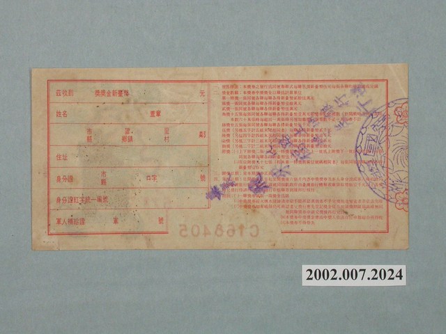 基本發行張數為六十萬張,橫式設計,中心「恭祝總統華誕」,松盆圖,由右至左,上列「愛國獎券」,「臺灣省政府委託臺灣銀行發行」,「新臺幣伍圓」,「第571期」,左「中華民國五十九年十一月五日開獎」,左下「丙聯」圓框,下列編號「C168405」。