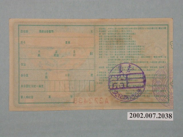 基本發行張數為六十萬張,橫式設計,「弘治窯嬌黃綠彩雙龍戲珠高足盌(明)」圖,「甲聯」,「愛國獎券」,「第585期」反共必勝浮水印,「新臺幣拾圓」,「臺灣省政府委託臺灣銀行發行」,「中華民國六十年三月廿五日開獎」,下列編號「A272438」。