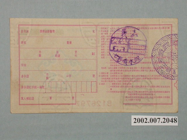 基本發行張數為六十萬張,橫式設計,「愛國獎券」,「中華民國六十年七月五日開獎」,「第595期」,「臺灣省政府委託臺灣銀行發行」,編號「B126797」反共必勝浮水印,「新臺幣拾圓」,「舊玉斧(周)」圖,「乙聯」。