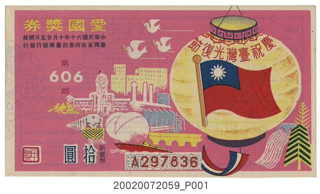 基本發行張數為六十萬張,橫式設計,「慶祝臺灣光復節」燈籠國旗圖,旁繪飾總統府、棒球、和平鴿和火車等重要建設圖樣,底列編號「A297836」全面革新浮水印,「愛國獎券」,「中華民國六十年十月廿五日開獎」,「臺灣省政府委託臺灣銀行發行」,「第606期」,「新臺幣拾圓」,「甲聯」。