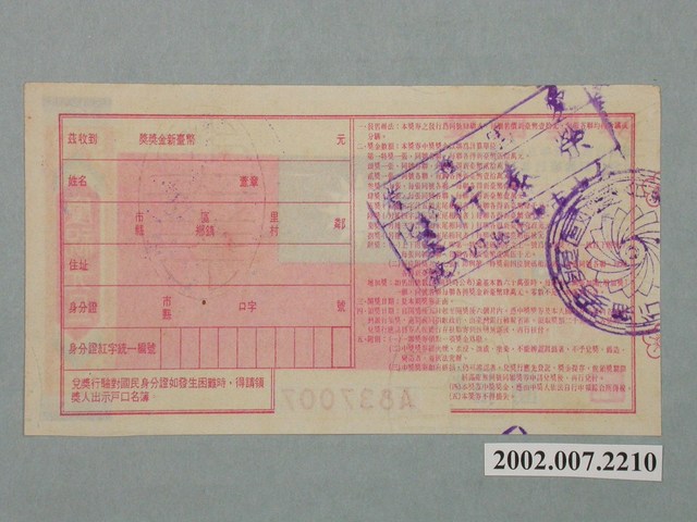 基本發行張數為六十萬張,橫式設計,「慶祝元旦」國旗圖,底列編號「A837007」厲行法治浮水印,「愛國獎券」,「中華民國六十五年元月五日開獎」,「臺灣省政府委託臺灣銀行發行」,「第757期」,「新臺幣拾圓」,「甲聯」。