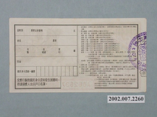 基本發行張數為六十萬張,一張同號三聯,橫式設計。愛國獎券,開獎日期中華民國六十六年五月廿五日,臺灣省政府委託臺灣銀行發行,「第807期」,新台幣貳拾圓,甲聯,編號「A862637」,底飾禮義廉恥浮水印。遼、宗室濬、不墜家風圖,題跋:濬,遼道宗帝長子,六歲能騎射,從帝獵,連發三矢皆中,帝喜曰:「朕祖宗皆善射,此兒不墜家風」。後遇十鹿當前,濬射獲其九。根據參考資料及梁又銘家屬提供的資料佐證,梁又銘先生自1962年起參與愛國獎券故事圖案繪製,於1971年介紹學生林幸雄參與愛國獎券製作(599期起),主要負責設計周邊圖案,以及特殊慶典、故宮文物、風景等圖案繪製。歷史故事畫稿仍由梁又銘先生提供,並多數有梁之鈐印,直到梁於1984年9月26日逝世後,愛國獎券仍持續發行其遺稿直到第1107期。而林幸雄先生則參與愛國獎券製作直到最後一期1171期。