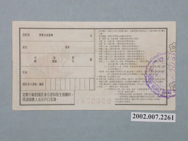 基本發行張數為六十萬張,一張同號三聯,橫式設計。愛國獎券,開獎日期中華民國六十六年六月五日,臺灣省政府委託臺灣銀行發行,「第808期」,新台幣貳拾圓,乙聯,編號「B509741」,底飾厲行法治浮水印。宋、趙普、補綴薦牘圖,題跋:普嘗迭次奏薦某人為官,均未見用,三次復奏,太祖怒裂其奏擲地,普神 色不變,拾歸補綴之,他日仍奏如初,太祖乃悟,卒用其人。根據參考資料及梁又銘家屬提供的資料佐證,梁又銘先生自1962年起參與愛國獎券故事圖案繪製,於1971年介紹學生林幸雄參與愛國獎券製作(599期起),主要負責設計周邊圖案,以及特殊慶典、故宮文物、風景等圖案繪製。歷史故事畫稿仍由梁又銘先生提供,並多數有梁之鈐印,直到梁於1984年9月26日逝世後,愛國獎券仍持續發行其遺稿直到第1107期。而林幸雄先生則參與愛國獎券製作直到最後一期1171期。