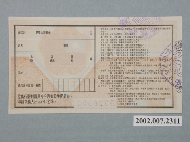 基本發行張數為六十萬張,一張同號四聯,橫式設計。愛國獎券,開獎日期中華民國六十七年十月廿五日,臺灣省政府委託臺灣銀行發行,「第858期」,新台幣貳拾圓,乙聯,編號「B328303」,底飾篤實誠信浮水印,此期發行臺灣光復節,圖案為慶祝臺灣光復節、國旗、梅花圖。