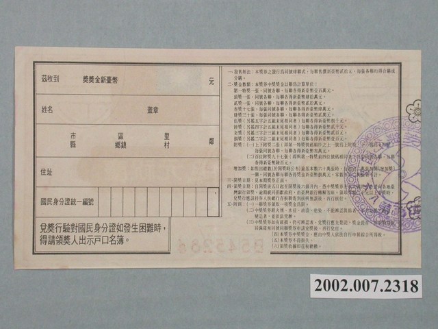 基本發行張數為六十萬張,一張同號四聯,橫式設計。愛國獎券,開獎日期中華民國六十八年元月五日,臺灣省政府委託臺灣銀行發行,「第865期」,新台幣貳拾圓,乙聯,編號「B545284」,此期發行適逢元旦,圖案為慶祝元旦、國旗圖。