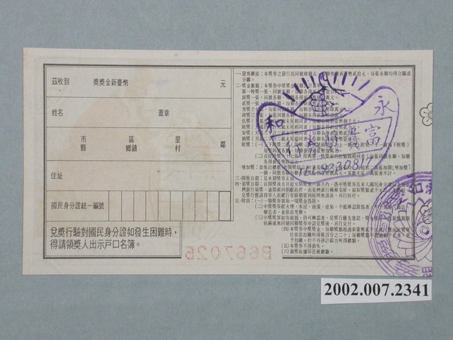基本發行張數為六十萬張,一張同號四聯,橫式設計。愛國獎券,開獎日期中華民國六十八年八月廿五日,臺灣省政府委託臺灣銀行發行,「第888期」,新台幣貳拾圓,乙聯,編號「B667025」。三國、曹彰、黃鬚勇將圖,題跋:彰勇敢善戰,所向皆捷,征鮮卑還,有功盡歸諸將,魏太祖大悅,持彰鬚曰:「黃鬚兒竟大奇也」。根據參考資料及梁又銘家屬提供的資料佐證,梁又銘先生自1962年起參與愛國獎券故事圖案繪製,於1971年介紹學生林幸雄參與愛國獎券製作(599期起),主要負責設計周邊圖案,以及特殊慶典、故宮文物、風景等圖案繪製。歷史故事畫稿仍由梁又銘先生提供,並多數有梁之鈐印,直到梁於1984年9月26日逝世後,愛國獎券仍持續發行其遺稿直到第1107期。而林幸雄先生則參與愛國獎券製作直到最後一期1171期。