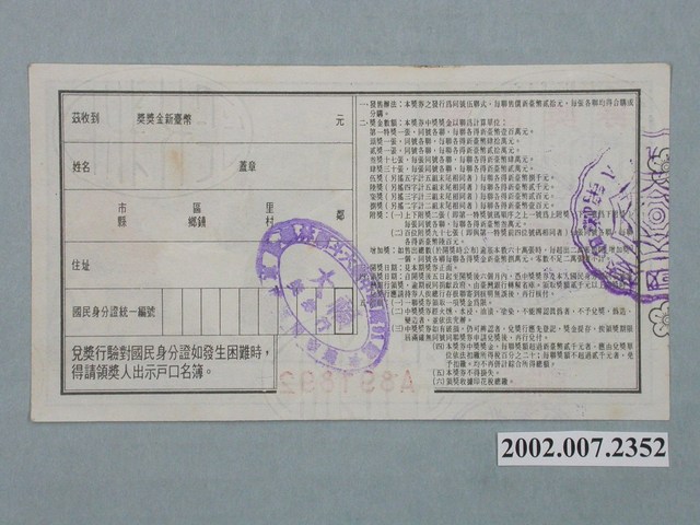 基本發行張數為六十萬張,一張同號五聯,橫式設計。愛國獎券,開獎日期中華民國六十八年十二月十五日,臺灣省政府委託臺灣銀行發行,「第899期」,新台幣貳拾圓,甲聯,編號「A891892」。南史、孔顗、拒受贈米圖,題跋:東土時遭大旱米貴,顗弟慮其乏糧,遣人運米五百斛贈之,顗曰:「吾在彼處三載,去官之日不辨有路糧,吾弟在彼不久,安得有此米耶?」卒不受。根據參考資料及梁又銘家屬提供的資料佐證,梁又銘先生自1962年起參與愛國獎券故事圖案繪製,於1971年介紹學生林幸雄參與愛國獎券製作(599期起),主要負責設計周邊圖案,以及特殊慶典、故宮文物、風景等圖案繪製。歷史故事畫稿仍由梁又銘先生提供,並多數有梁之鈐印,直到梁於1984年9月26日逝世後,愛國獎券仍持續發行其遺稿直到第1107期。而林幸雄先生則參與愛國獎券製作直到最後一期1171期。