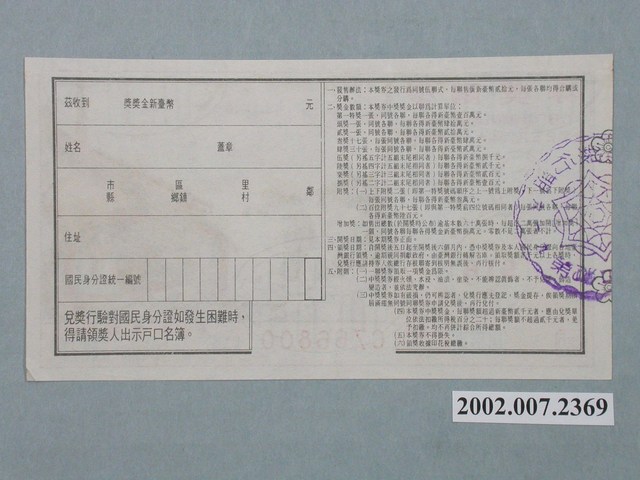 基本發行張數為六十萬張,一張同號五聯,橫式設計。愛國獎券,開獎日期中華民國六十九年六月五日,臺灣省政府委託臺灣銀行發行,「第916期」,新台幣貳拾圓,丙聯,編號「C766800」,底飾建國必成浮水印。三國、陸績、載石還家圖,題跋:陸績為鬱林太守,罷官之日,行裝儉樸,舟輕不堪海浪,乃於岸上取石壓舟,始得返家,里人敬其廉,因名其石為「廉石」。根據參考資料及梁又銘家屬提供的資料佐證,梁又銘先生自1962年起參與愛國獎券故事圖案繪製,於1971年介紹學生林幸雄參與愛國獎券製作(599期起),主要負責設計周邊圖案,以及特殊慶典、故宮文物、風景等圖案繪製。歷史故事畫稿仍由梁又銘先生提供,並多數有梁之鈐印,直到梁於1984年9月26日逝世後,愛國獎券仍持續發行其遺稿直到第1107期。而林幸雄先生則參與愛國獎券製作直到最後一期1171期。