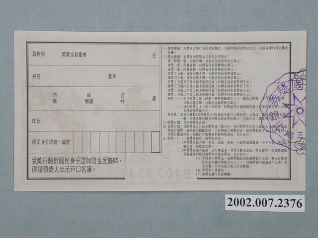 基本發行張數為六十萬張,一張同號五聯,橫式設計。愛國獎券,開獎日期中華民國六十九年八月十五日,臺灣省政府委託臺灣銀行發行,「第923期」,新台幣貳拾圓,乙聯,編號「B107333」。晉、周顗、罵賊受戟圖,題跋:王敦作亂,顗被執,路經太廟,大呼曰:「賊臣傾覆社稷,神祇有靈,速殺之,毋令縱毒以害天下。」語未畢,賊眾以戟傷其口,血流至踵,臉色不變。根據參考資料及梁又銘家屬提供的資料佐證,梁又銘先生自1962年起參與愛國獎券故事圖案繪製,於1971年介紹學生林幸雄參與愛國獎券製作(599期起),主要負責設計周邊圖案,以及特殊慶典、故宮文物、風景等圖案繪製。歷史故事畫稿仍由梁又銘先生提供,並多數有梁之鈐印,直到梁於1984年9月26日逝世後,愛國獎券仍持續發行其遺稿直到第1107期。而林幸雄先生則參與愛國獎券製作直到最後一期1171期。