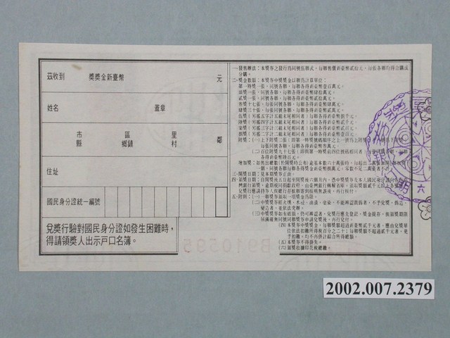 基本發行張數為六十萬張,一張同號五聯,橫式設計。愛國獎券,開獎日期中華民國六十九年九月十五日,臺灣省政府委託臺灣銀行發行,「第926期」,新台幣貳拾圓,乙聯,編號「B910595」。後漢、吳祐、杵臼定交圖,題跋:祐為宏農令,勸善懲貪,吏民欽服,時公沙穆來遊太學,無資糧,乃變服為傭,為祐任舂,祐與語大驚,遂共定交於杵臼之間。根據參考資料及梁又銘家屬提供的資料佐證,梁又銘先生自1962年起參與愛國獎券故事圖案繪製,於1971年介紹學生林幸雄參與愛國獎券製作(599期起),主要負責設計周邊圖案,以及特殊慶典、故宮文物、風景等圖案繪製。歷史故事畫稿仍由梁又銘先生提供,並多數有梁之鈐印,直到梁於1984年9月26日逝世後,愛國獎券仍持續發行其遺稿直到第1107期。而林幸雄先生則參與愛國獎券製作直到最後一期1171期。
