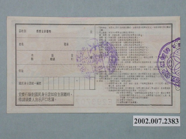 基本發行張數為六十萬張,一張同號五聯,橫式設計。愛國獎券,開獎日期中華民國六十九年十月二十五日,臺灣省政府委託臺灣銀行發行,「第930期」,新台幣貳拾圓,戊聯,編號「E293707」。此期發行適逢光復節,圖案為慶祝臺灣光復節、國旗、臺灣地圖。