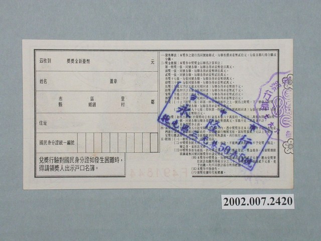 基本發行張數為六十萬張,一張同號六聯,橫式設計。愛國獎券,開獎日期中華民國七十年十一月五日,臺灣省政府委託臺灣銀行發行,「第967期」,新台幣貳拾圓,己聯,編號「F491844」。元、姚天福妻、拒受賄賂圖,題跋:天福出任江南湖北道按察使,迭發省臣贓事,州郡稱治,有以金銀賄天福妻楊氏,楊氏命將賄物詣憲司曰:「吾夫劾平章,何以是賄我?」憲司嘆曰:「豈惟汝廉,若妻亦廉矣。」根據參考資料及梁又銘家屬提供的資料佐證,梁又銘先生自1962年起參與愛國獎券故事圖案繪製,於1971年介紹學生林幸雄參與愛國獎券製作(599期起),主要負責設計周邊圖案,以及特殊慶典、故宮文物、風景等圖案繪製。歷史故事畫稿仍由梁又銘先生提供,並多數有梁之鈐印,直到梁於1984年9月26日逝世後,愛國獎券仍持續發行其遺稿直到第1107期。而林幸雄先生則參與愛國獎券製作直到最後一期1171期。