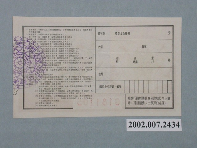 基本發行張數為六十萬張,一張同號八聯,橫式設計。愛國獎券,開獎日期中華民國七十一年三月二十五日,臺灣省政府委託臺灣銀行發行,「第981期」,新台幣貳拾圓,庚聯,編號「G181105」。明、尚坤、不負友託圖,題跋:﹝彰德府志﹞:尚坤好善樂施,有友寄金於其家,時值江水暴漲,廬舍淹沒,坤獨負金,攀登高樹,及水退,乃攜金還友,人皆稱義。根據參考資料及梁又銘家屬提供的資料佐證,梁又銘先生自1962年起參與愛國獎券故事圖案繪製,於1971年介紹學生林幸雄參與愛國獎券製作(599期起),主要負責設計周邊圖案,以及特殊慶典、故宮文物、風景等圖案繪製。歷史故事畫稿仍由梁又銘先生提供,並多數有梁之鈐印,直到梁於1984年9月26日逝世後,愛國獎券仍持續發行其遺稿直到第1107期。而林幸雄先生則參與愛國獎券製作直到最後一期1171期。