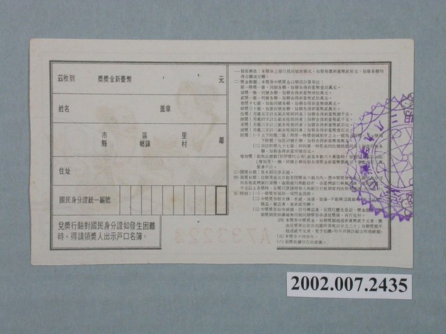 基本發行張數為六十萬張,一張同號八聯,橫式設計。愛國獎券,開獎日期中華民國七十一年四月五日,臺灣省政府委託臺灣銀行發行,「第982期」,新台幣貳拾圓,甲聯,編號「A733223」。宋、順德徐氏、勸夫免禍圖,題跋:徐氏夫梁亞三,誤交惡少,將謀為盜,徐氏聞之,一日,置備雞酒,待夫飽後,乃婉言勸之,夫感悟,與惡少絕,後諸盜事發,其夫幸而免禍。根據參考資料及梁又銘家屬提供的資料佐證,梁又銘先生自1962年起參與愛國獎券故事圖案繪製,於1971年介紹學生林幸雄參與愛國獎券製作(599期起),主要負責設計周邊圖案,以及特殊慶典、故宮文物、風景等圖案繪製。歷史故事畫稿仍由梁又銘先生提供,並多數有梁之鈐印,直到梁於1984年9月26日逝世後,愛國獎券仍持續發行其遺稿直到第1107期。而林幸雄先生則參與愛國獎券製作直到最後一期1171期。