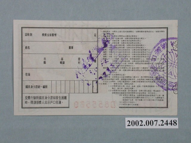 基本發行張數為六十萬張,一張同號八聯,橫式設計。愛國獎券,開獎日期中華民國七十一年八月十五日,臺灣省政府委託臺灣銀行發行,「第995期」,新台幣貳拾圓,丁聯,編號「D855569」,底飾建國必成浮水印。前秦、姜宇妻、賞識貧士圖,題跋:姜宇少孤貧,牧羊於陳家,每夜讀達旦不止,陳翁欲妻以女,令女潛觀之,女曰:「此豈終為人下者」。女乃歸宇,宇益力學,後登仕,為京兆尹,御史中丞。根據參考資料及梁又銘家屬提供的資料佐證,梁又銘先生自1962年起參與愛國獎券故事圖案繪製,於1971年介紹學生林幸雄參與愛國獎券製作(599期起),主要負責設計周邊圖案,以及特殊慶典、故宮文物、風景等圖案繪製。歷史故事畫稿仍由梁又銘先生提供,並多數有梁之鈐印,直到梁於1984年9月26日逝世後,愛國獎券仍持續發行其遺稿直到第1107期。而林幸雄先生則參與愛國獎券製作直到最後一期1171期。
