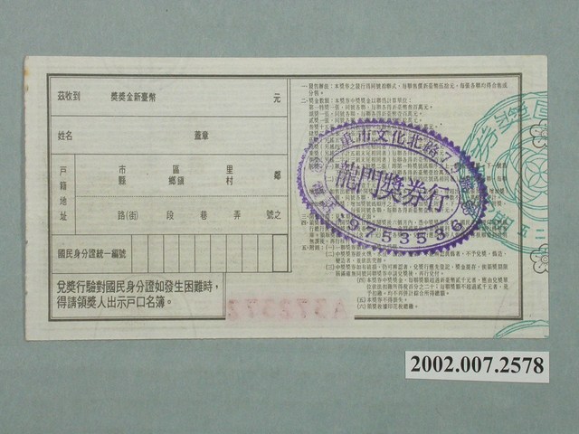 基本發行張數為六十萬張,一張同號十聯,橫式設計。愛國獎券,開獎日期中華民國七十五年三月二十五日,臺灣省政府委託臺灣銀行發行,「第1125期」,新台幣伍拾圓,甲聯,編號「A372372」。中正紀念堂圖。