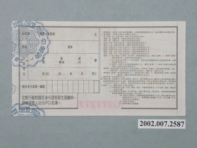 基本發行張數為六十萬張,一張同號八聯,橫式設計。愛國獎券,開獎日期中華民國七十五年六月二十五日,臺灣省政府委託臺灣銀行發行,「第1134期」,新台幣伍拾圓,庚聯,編號「G277272」。左營蓮池潭龍虎塔圖。