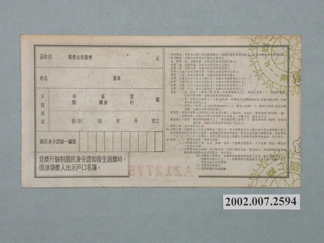 基本發行張數為六十萬張,一張同號八聯,橫式設計。愛國獎券,開獎日期中華民國七十五年九月五日,臺灣省政府委託臺灣銀行發行,「第1141期」,新台幣伍拾圓,甲聯,編號「A212775」。明、嘉靖窯五彩天馬蓋罐圖。