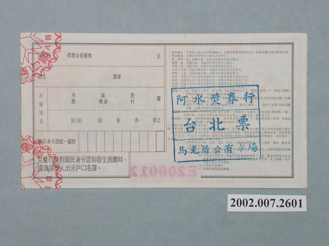 基本發行張數為六十萬張,一張同號八聯,橫式設計。愛國獎券,開獎日期中華民國七十五年十一月十五日,臺灣省政府委託臺灣銀行發行,「第1148期」,新台幣伍拾圓,戊聯,編號「E200012」。清、鍍金壇城圖。