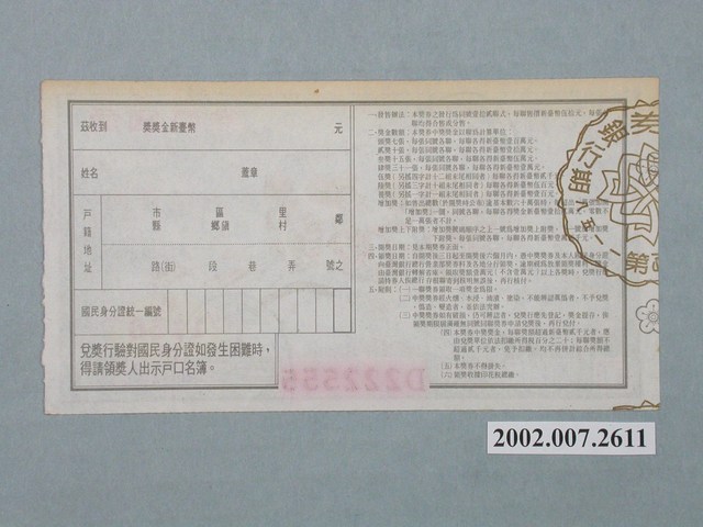 基本發行張數為六十萬張,一張同號十二聯,橫式設計。愛國獎券,開獎日期中華民國七十六年六月十日,臺灣省政府委託臺灣銀行發行,「第1158期」,新台幣伍拾圓,丁聯,編號「D222555」。急流泛舟圖,獎券右方印有「團隊精神」。