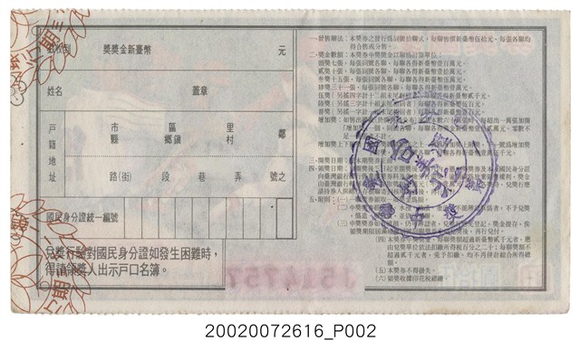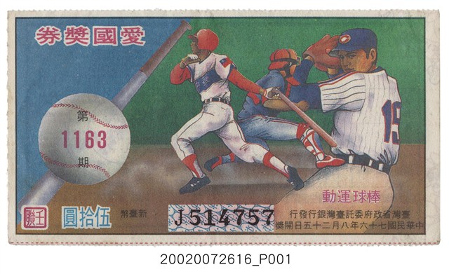 基本發行張數為六十萬張,一張同號十聯,橫式設計。愛國獎券,開獎日期中華民國七十六年八月二十五日,臺灣省政府委託臺灣銀行發行,「第1163期」,新台幣伍拾圓,壬聯,編號「J514757」。棒球運動圖。