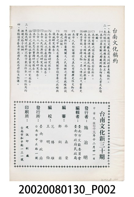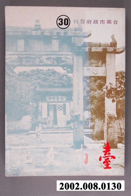 本物件為《臺南文化》重新發刊後第30期,故名新三十期,臺南市政府發行,封面照片為「全臺首學」孔廟之舊照片。封面解說為范勝雄。本期內容有「台灣的氣候俚諺、清季台南循吏包容事蹟考、赤崁樓與安平古堡間神祕地道挖探紀實、府城藝壇隨筆、安陽是吾鄉」等題目。民國79年12月31日發行。