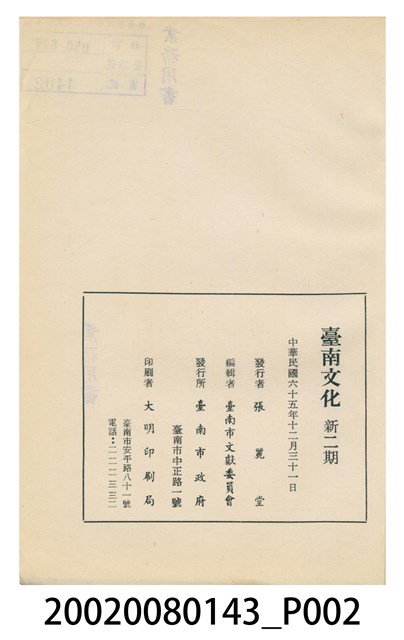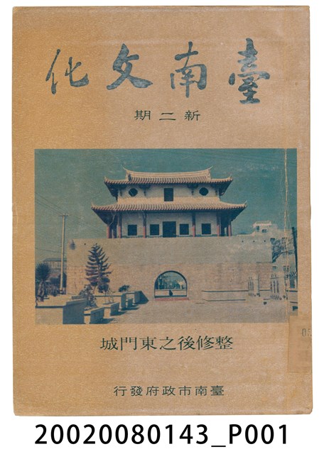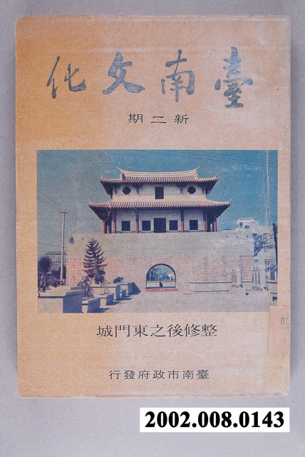 本物件為《臺南文化》重新發刊後第2期,故名新二期,臺南市政府發行,封面照片為修建後之東城門。本期內容有「天壇言今、臺南三山國王廟裏的韓文公祠、瀛洲風月記、歐洲的壁鎖、四草湖觀光區規劃、韓石爐先生事略、整修名勝古蹟、介紹臺灣史蹟研究會」等題目。民國65年12月31日發行。