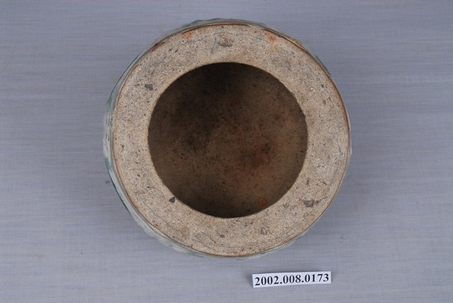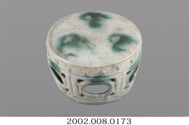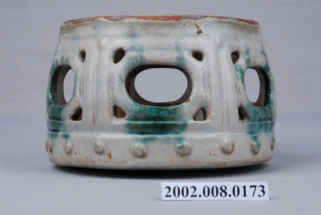 1. 本件為交趾陶灶椅,長19.3公分、寬19.3公分、高12.2公分,在器體上多個鏤空構成八角形的器身裝飾,在頂部則有一週突釘。器表皆施以白色與綠色的低溫鉛釉,器足底部與內部則不施釉。2. 灶椅是傳統社會中,在廚房爐灶前,提供給生火炊煮的人,蹲坐用的矮凳。故形式較一般座椅低矮。臺灣常見的灶椅材質多為簡單的歸仁窯紅陶等材質,此類以低溫鉛釉作為裝飾的作法非常少見。在鏤空與突釘的器體細節上,也叫接近於傳統家具中的鼓凳(墩),是屬於做工較為精緻的器物。