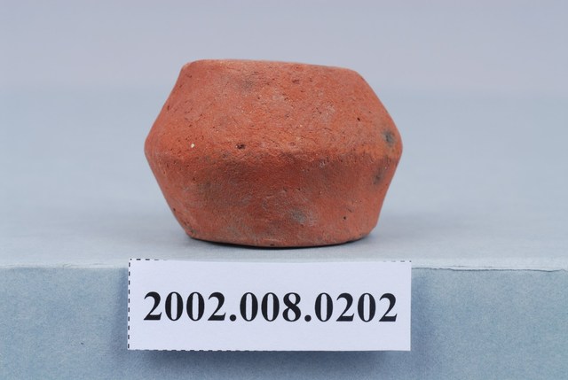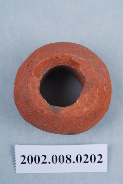 1.此物件為網墜的陶製沉子,為一中空圓珠狀磚紅色陶製品,沉子的開口處有明顯的缺口,表面則有多處些微坑洞。 2.網墜是繫於漁網下方使得漁網能下沉於水面之下的一種漁具,為了能沉於水下通常採用密度較高的物質製成,如石材、陶瓷、金屬等。