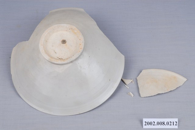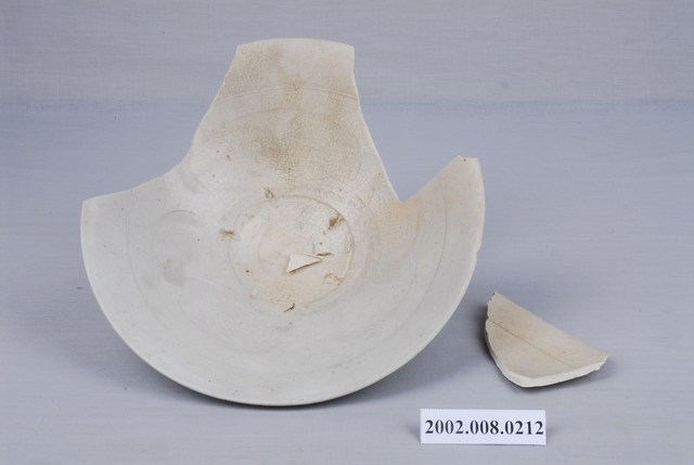 素面弦紋大碗殘件是一件斗笠形大碗的殘片,圓唇,口沿外侈,窄、深腹,斜直壁下收至圈足,圈足徑窄小,僅約為口徑的三分之一大小,圈足及圈足內皆露胎,胎色白皙,胎質細緻,薄胎薄釉。全器除圈足外,皆施白釉,釉色暖白,略偏黃,釉面有氣孔以及些微雜質,並在碗內壁可見許多開片痕跡,都是在燒製過程受溫度影響造成的。碗心則有五個支釘痕跡,應是墊燒時所遺留的墊圈支釘。全器素面無紋,僅內壁中段劃出一圈弦紋裝飾,十分嫻雅。
