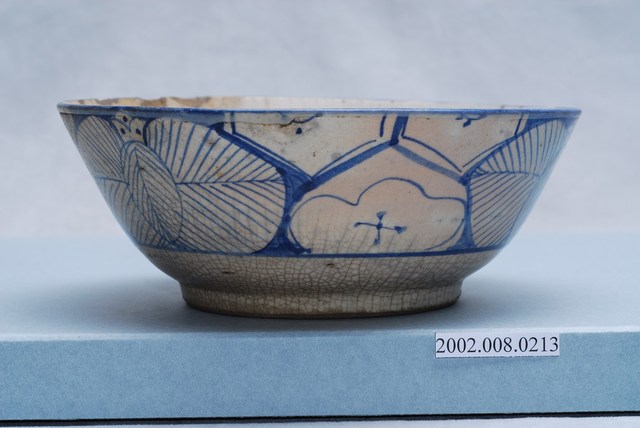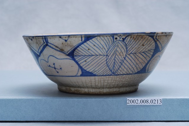 青花葉紋敞口碗,敞口,圓唇,弧壁下收,圓腹,碗底寬大,底有圈足。全器施白釉,以鈷料彩繪裝飾,採疊燒技法,碗心一圈刮釉,碗內壁僅中央飾有雙線弦紋,其餘面積保持素面,碗外壁飾青花細線條繪製而成的圓葉、葉脈與花朵紋樣,唇部以青花塗滿。此碗表面佈滿細小開片,碗內壁一側、碗外壁腹部下半與圈足尤其明顯,口沿可見碰撞缺口與裂縫,可見應被頻繁使用過。