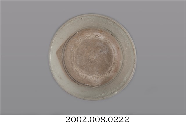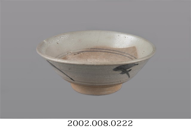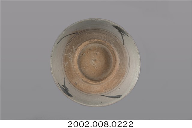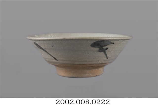 青花花卉紋敞口碗,圓唇,斜壁下收,底部方折,帶圈足。碗外壁腹部至碗內壁腹部上半施淺灰色釉,內外器壁緣口處略縮釉,碗內壁腹部下半至碗心,以及外碗底與圈足露胎,胎色磚紅。碗內壁中央以藍色鈷料繪製雙線弦紋,碗外壁腹部近底處亦飾有雙線弦紋,其上方隨意寫意幾筆枝葉,均勻分布在碗外壁四周。