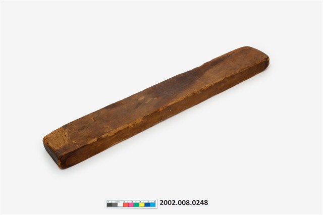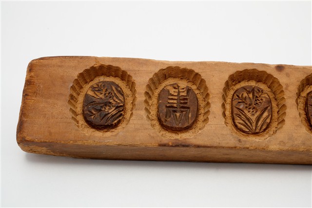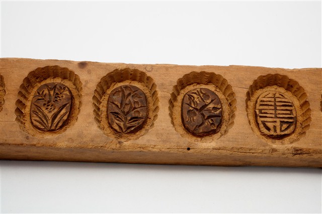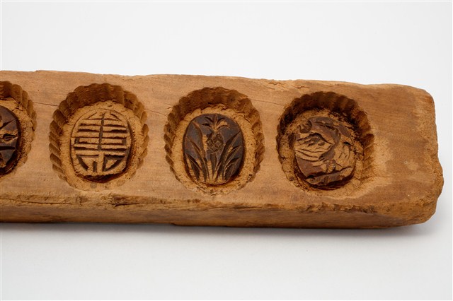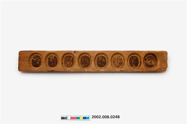 長條板單面雕八花形糕印,印模由左至右第一枚刻鳳梨紋,第二枚刻「壽」字,第三枚刻鳳梨紋,第四枚刻桃樹紋,第五枚刻石榴紋,第六枚刻「壽」字,第七枚刻鳳梨紋,第八枚刻仙鶴紋。整組糕模呈現的是福、祿、壽、財的概念,一次可壓印八枚花形糕印。