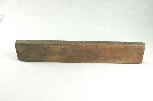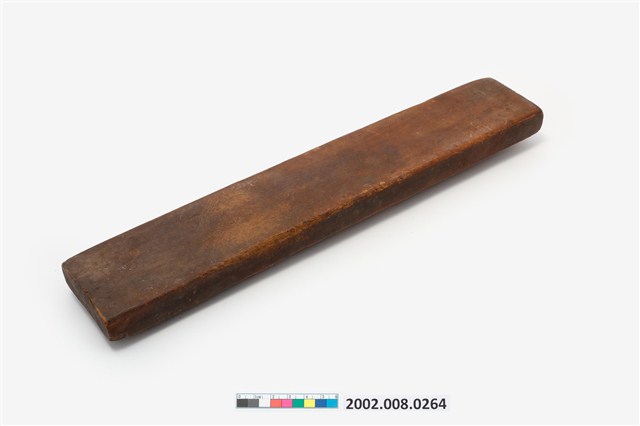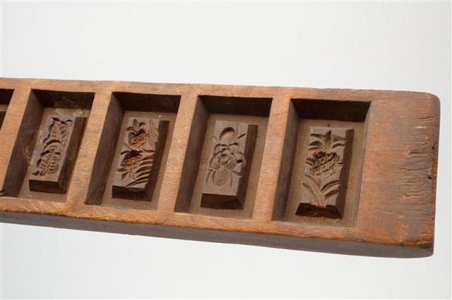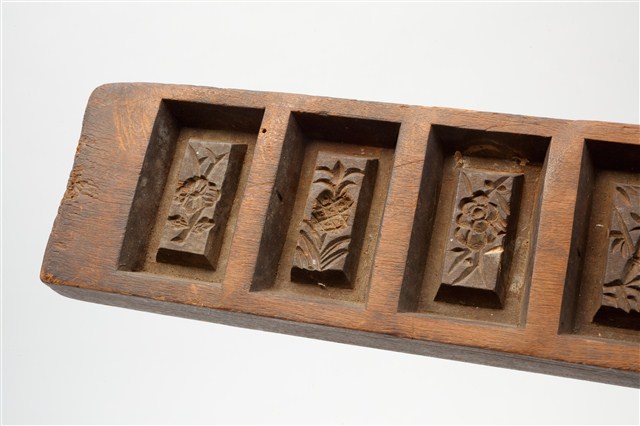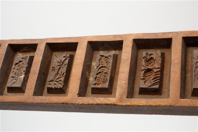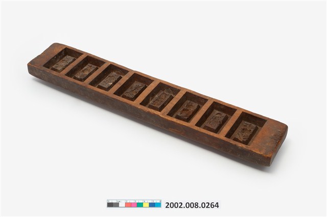 長條板單面雕八長方錠糕印,一面平整,一面雕刻8枚長方錠,糕印中間突出的造型結構是長方錠糕印特有的形制。印紋由左至右第一枚刻菊花紋,第二枚刻鳳梨紋,第三枚刻桃花紋,第四枚刻竹葉紋,第五枚刻芭蕉葉紋,第六枚刻鳳梨紋,第七枚刻柿花紋,第八枚刻鳳梨紋。本件一次可壓印八枚長方錠糕印,用於製作年節祭祀時象徵古代銀子的糕仔包。