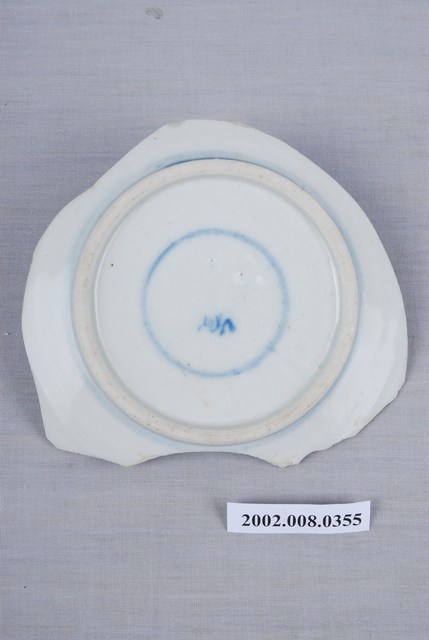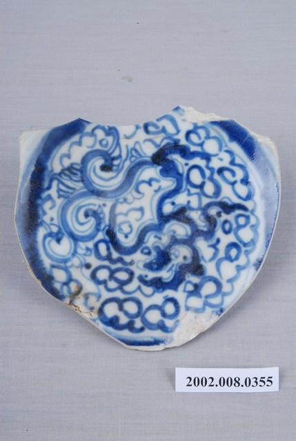 1.青花變形紋飾大盤殘片是一件大圓盤的殘片,由破損處可見胎色白中略帶黃,胎質略粗糙且參雜些許雜質。全器施白釉,呈色乳白,通器紋飾以鈷藍釉繪成,青花發色深藍,釉色略有不均。器表有許多氣孔以及脫釉痕跡,是燒製時溫度過高所產生的痕跡。盤面滿佈紋飾,以一寬裝飾帶繪圈紋,其內填滿線條表現為主的紋樣,推測可能是經過變化的卷雲紋、龍紋等。盤底圈足內、外皆有一圈弦紋,圈足內有一款識。2.這些紋飾應有原始的構圖,但由於大量生產亦或是工匠並沒有看過原圖,只能憑空想像、依樣畫葫蘆而成,是清末民窯常見的現象,別有一番野趣。
