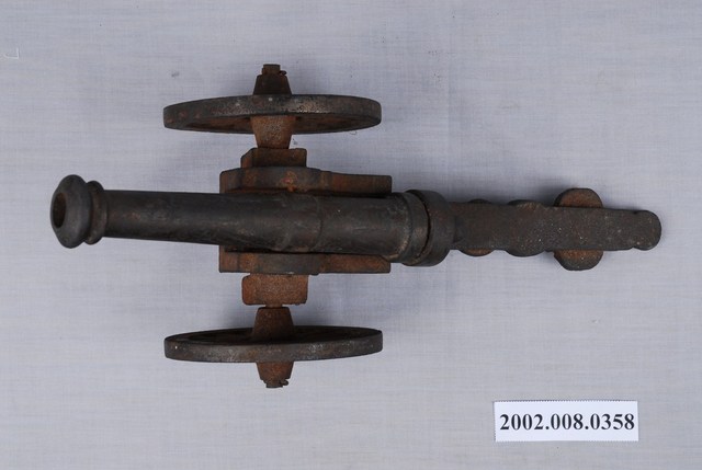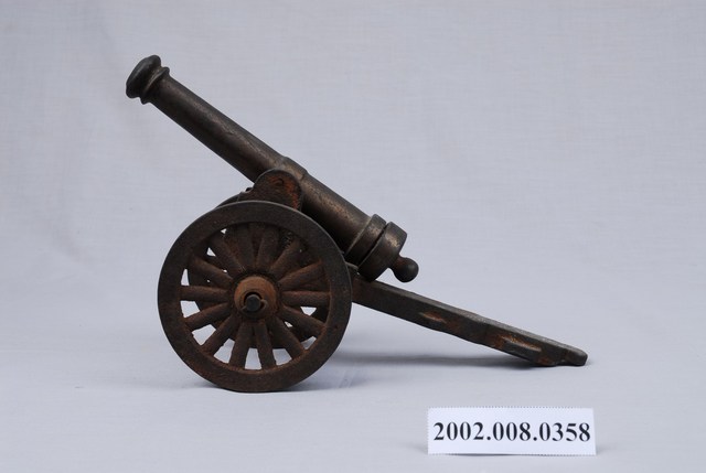 本件牽引式火炮模型主要作為擺飾使用,可分為砲架與砲身2部分,砲架以鑄鐵製成,其表面已略帶鏽痕,呈長條形結構,前端帶有兩片板耳,可以砲身凸出之砲耳接合,末端作曳引架與地面支撐架使用。砲架兩側帶有車輪,為傳統車輪樣式,外框作圓環型框架,框內帶有放射形幅條。砲身為前膛式,即由前方砲口塞入火藥包與鐵製彈丸,其材質為黃銅製作。