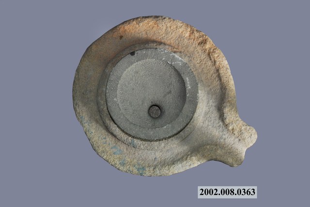 1.本件結構由上下兩座貼合而成,下座凸起的圓周直徑大於承接的上座部位,上下座當中有軸,稱為「石磨心」,轉動時可形成摩擦力,使豆穀磨成漿。上座部分,呈圓餅狀,頂部的周邊有一圈較高的圓環,帶有些許白色斑駁的刮痕,環邊逐漸向一側孔洞處漸凹陷,作用是防止投入的豆穀向外傾洩;由頂部貫穿至底的圓形孔洞,是浸泡好的豆或米的投入口;邊壁還可見明顯的敲鑿痕跡與鐵線箍綁的鏽痕,扁方形的孔洞是做為榫接木製磨把之用。下座中間圓餅狀的凸起部位較一般石磨為淺,周圍有溝槽,供承接磨出的水漿,溝槽設計由後向前略有傾斜度,至流嘴處最低,使研磨出的水漿易於流向流嘴處承接的粿袋或桶內。因經久使用與年代久遠,轉折稜角處除了有部分破損也呈現較平緩滑順狀態,環形溝槽周邊已有明顯的破損、粗糙感與泥塵沾污。本件由於上下座的圓周徑不同,再加上石材上有明顯差異,推測應是各自相配的上座與下座毀損,而先民們慣於簡樸,所以將兩個不同組的石磨湊在一起繼續使用。此件石磨體積中等,可一人或兩人操作使用。2. 石磨為臺灣早年農村生活中,多數家庭所有的工具之一。由兩片重達數十公斤的石頭和一根能夠旋轉石磨的搖桿所組成,操作時藉由磨鉤或磨把轉動時上座的磨石,以順時鐘方向推動,將要研磨的豆類或米穀放進上座頂面的孔洞中,並時時注入些許的水,磨出的漿液便會流下至底石的溝槽,再從流嘴處流出至承接的粿袋或桶中。將浸泡好的豆或米倒入磨石頂孔,一邊推動磨石,一邊將浸泡好的豆或米倒入磨石頂孔。
