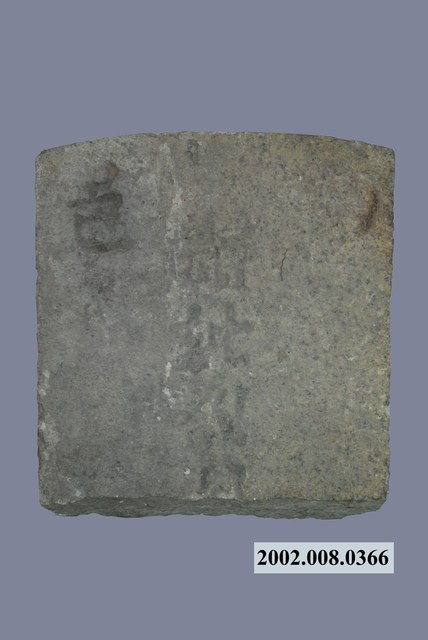 本文物為墓碑,僅存上部殘件。墓碑亦稱墓牌、墓表,為墓最重要的部分,為永久留存,幾皆以石材製成。臺灣最常見的形式是以三片石板拼成,中為碑心,兩側為肩石,稱為三合碑。墓碑碑心刻文中題為墓主祖籍地、性別、姓名、世代、諡號、頭銜,左題為立碑年代、墓主卒年,右題為墓主後代及立碑人名。本件文物為碑心,中題「□邑」為墓主祖籍地,「顯考」為男性,其下字跡模糊無法辨識。